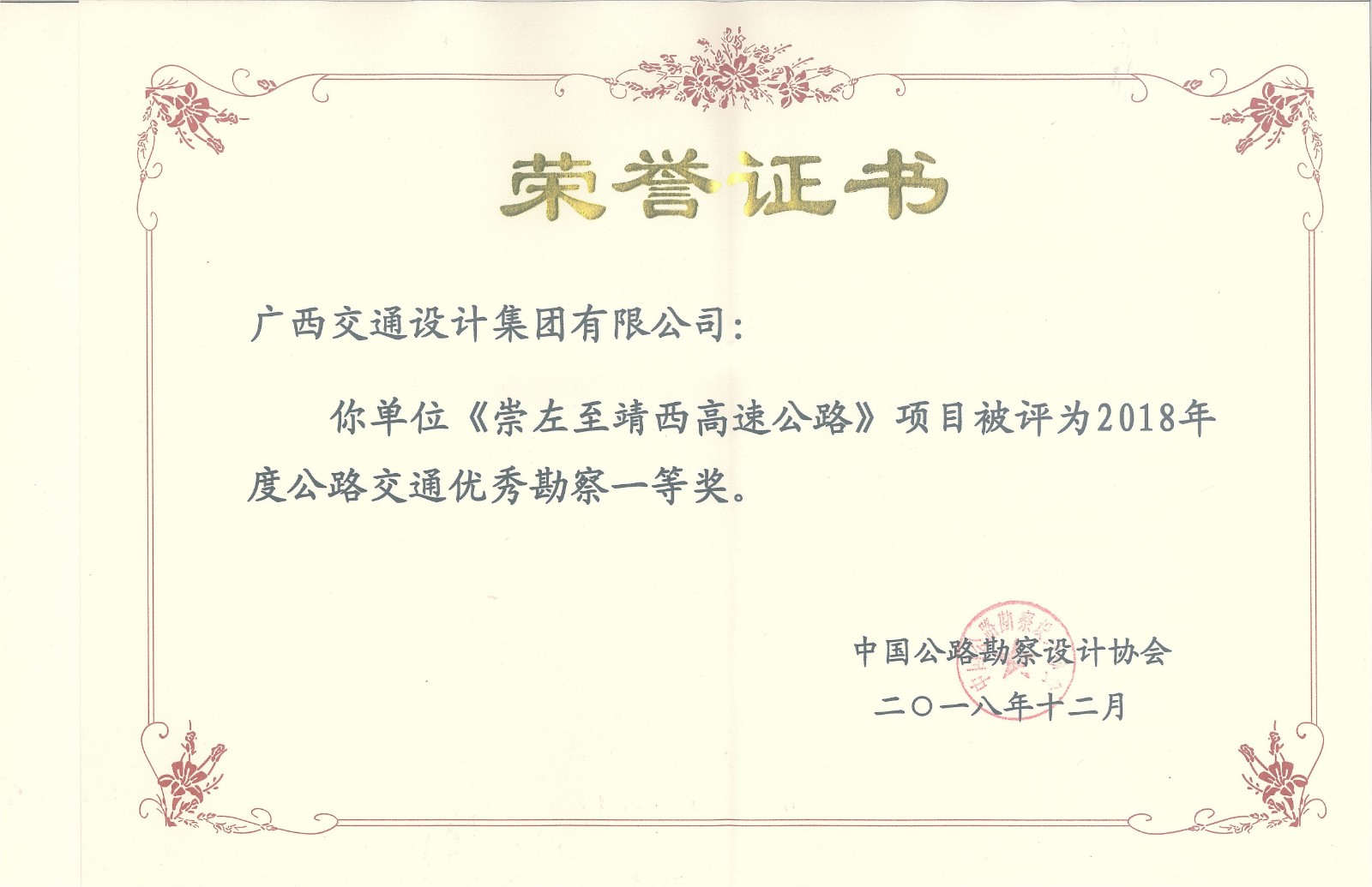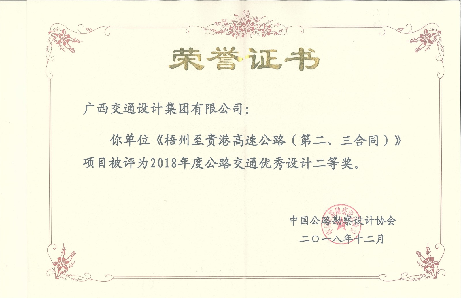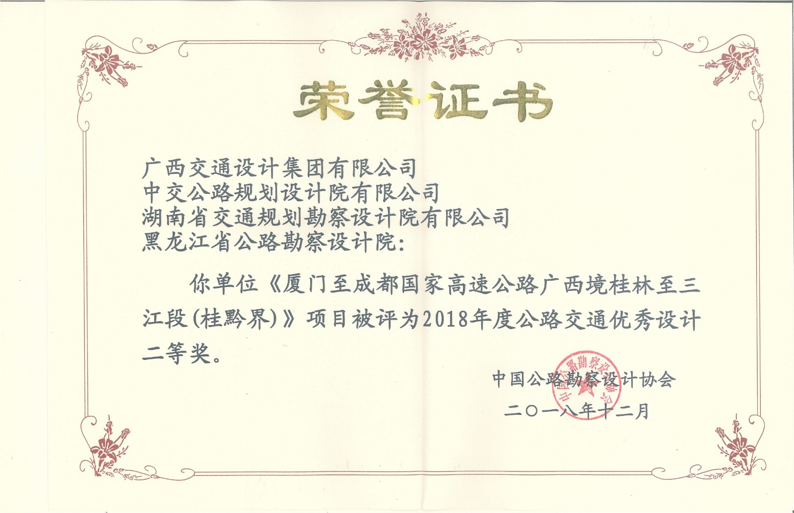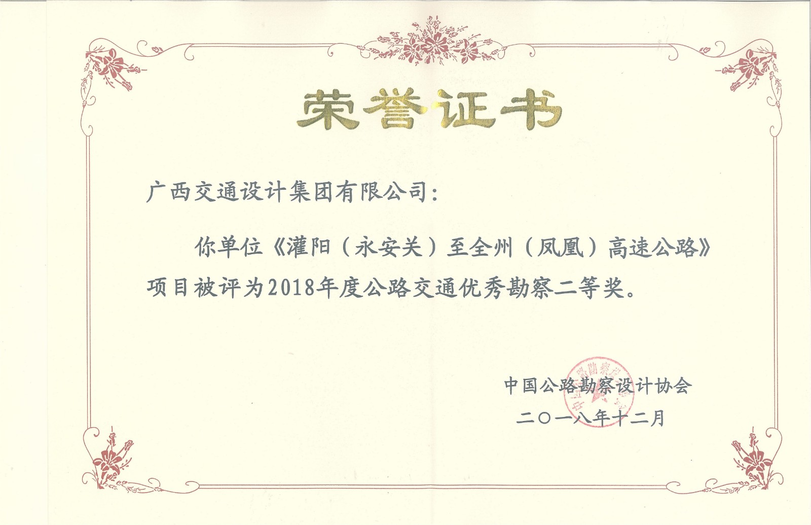 由我集团公司完成的崇左至靖西(第三合同段)、灌阳(永安关)至全州(凤凰)高速公路分别获得年度公路交通优秀勘察一等奖、二等奖,同时梧州至贵港高速公路、厦门至成都国家高速公路广西境桂林至三江段(桂黔界)获得年度公路交通优秀设计二等奖。