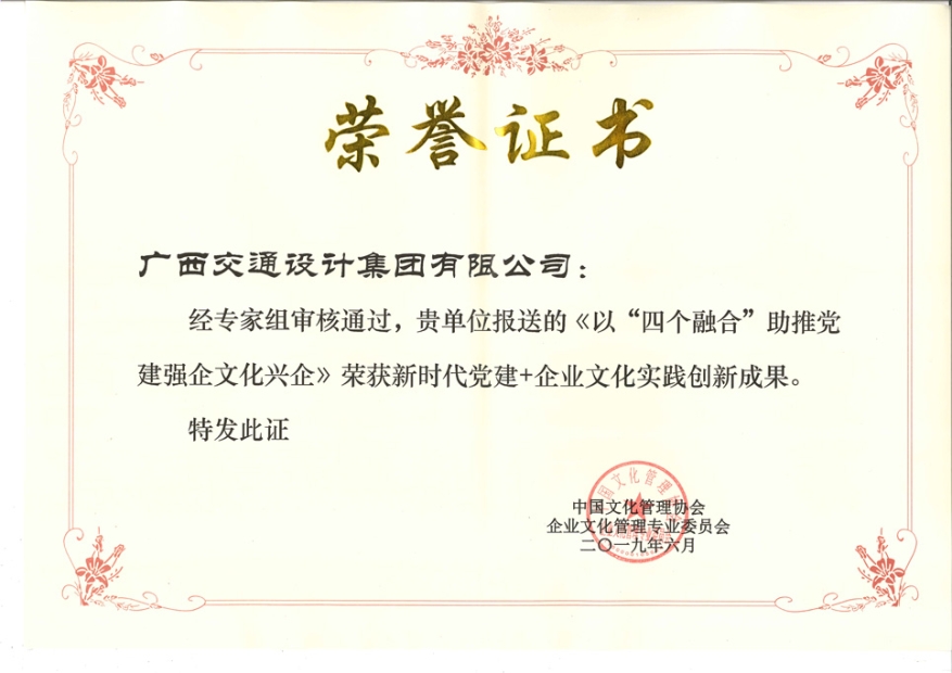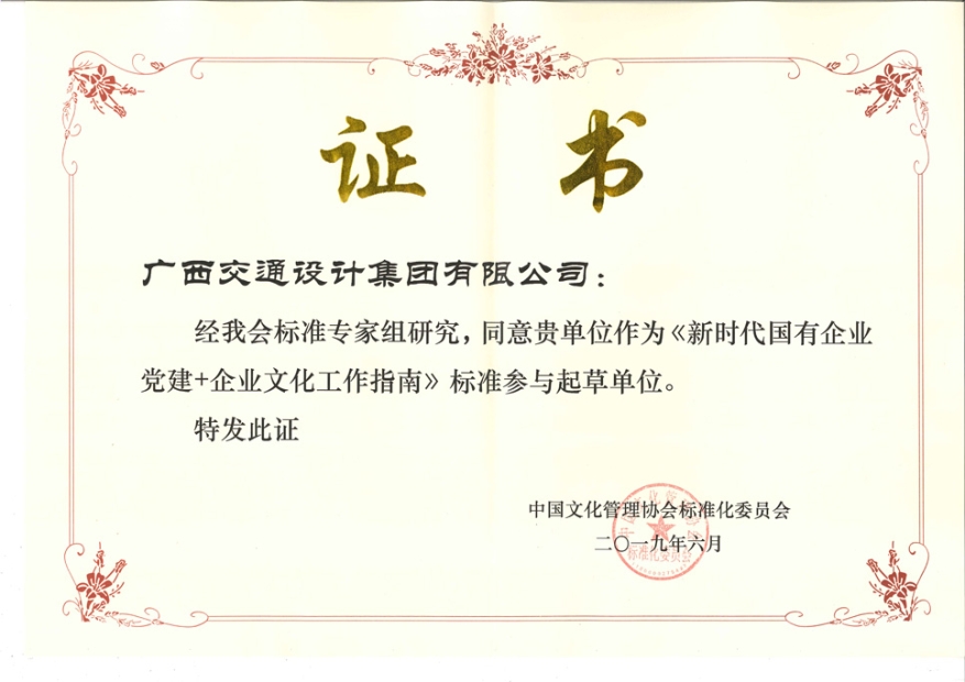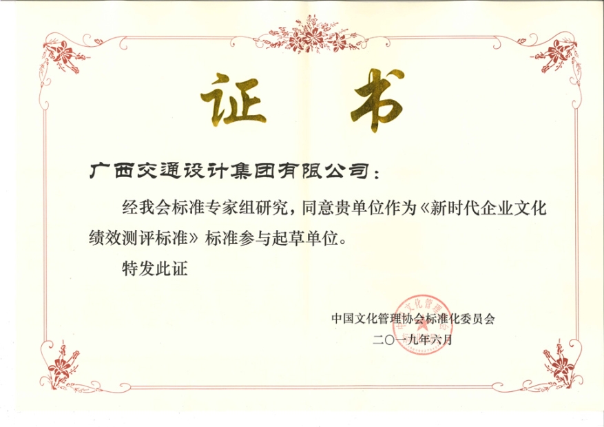 会上,中国文化管理协会企业文化管理专业委员会正式同意我集团公司作为《新时代国有企业党建+企业文化工作指南》《新时代企业文化绩效测评标准》等相关制度标准的参与起草单位,为全国企业建设企业文化提供广西交通设计集团智慧。