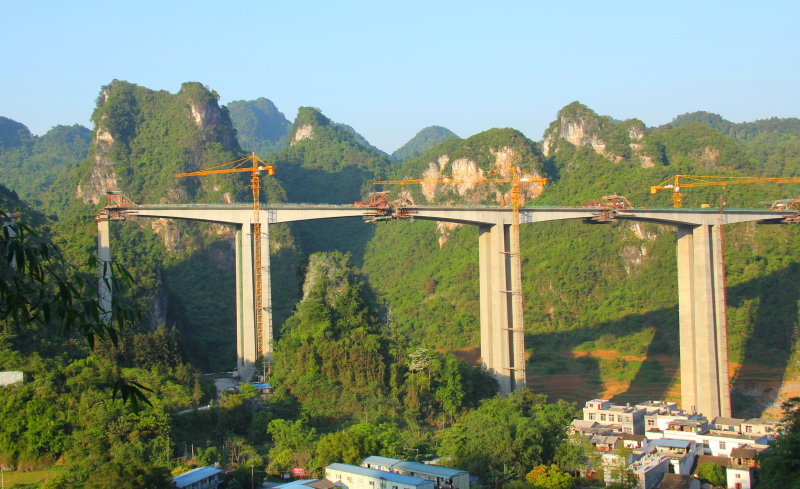 古龙山大桥是崇靖路重点控制性工程,处于我院承担勘察设计的标段,由我院第一道桥设计分院设计。大桥位于靖西县湖润镇古龙山风景区,全长970米,主桥横跨古龙山峡谷景区地下暗河,右幅主桥布置为65米+3×120米+65米,采用五跨预应力混凝土连续刚构。主桥墩身最高为107米,为广西境内少有的超百米高墩桥梁之一。(图文来自广西高投)