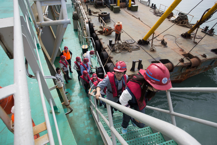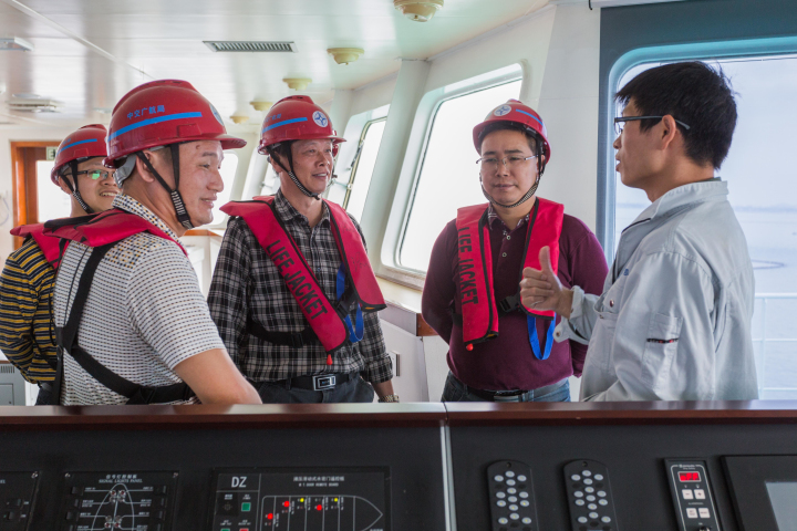 11月3日下午,回访组一行首先来到北海港铁山港区航道疏浚二期扩建工程的建设工地,在项目施工单位中交广航局管理人员的带领下,对目前疏浚工程的船机发展形势和施工新方法进行参观和学习。根据施工单位介绍,目前沿海疏浚工程常用绞吸挖泥船、耙吸挖泥船和抓斗挖泥船进行疏浚工程作业,随着近年来船舶大型化发展趋势,现阶段最大的挖泥船型号已发展到7025m3绞吸挖泥船和10485m3耙吸挖泥船,同时耙吸挖泥船在保留原本自航挖卸泥功能的情况下还增加了艏吹功能,即可在船抛锚固定之后,在船头接管线直接进行吹填。回访组登上了正在进行吹填施工作业的“浚海6”号10485m3耙吸挖泥船,在船长的介绍下了解了船体的主要性能和挖泥作业的主要参数,并参观了船舱驾驶室、吹泥作业操控台和船舶通讯操控台等区域,对耙吸挖泥船挖泥、吹泥作业施工方法有了直观的认识。(水运分院)