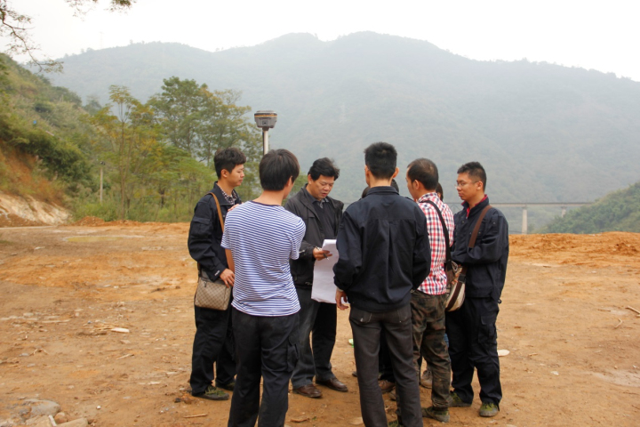 本次测量由分院院长韦勇克同志带队,作为一名经验丰富的“老测工”,他带领年轻的测量队员们一起穿梭在旧州的高山密林中,翻山越岭、跋山涉水,指导同事们看地形、安全高效地开展测量工作。因项目线型复杂,本次测量特邀院总工办苏志强副总工程师现场指导。苏总不辞辛劳,与项目主要负责人沿线查勘地形地势,研究路线走向,并耐心地向年轻的队员们讲解道路工程系统测量的思路、方法、要点,传授外业测量经验,其严谨的态度、丰富的经验、随和的谈吐给年轻同事们留下了深刻的印象。