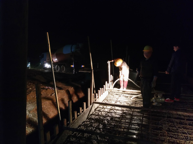 在施工现场,项目负责人、技术人员和工人们日夜奋战,大型机械来回穿梭,机声隆隆,一派热火朝天的景象:白天绑扎钢筋、装模、验模、埋置预埋管,晚上进行混凝土浇筑,不辞劳苦、通宵达旦,完成了右幅人行通道端部厕所、楼梯口及收费大棚六根柱子的施工,保障了工程进度按期按质进行。